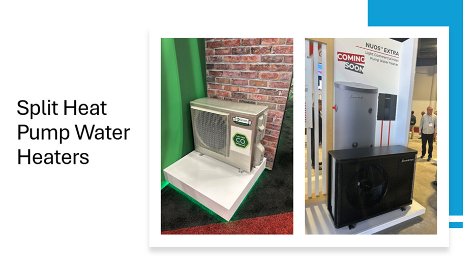 Finally, split HPWHs were another form factor on display and a topic of conversation at AHR. Split HPWHs are water heaters where the compressor is outside and the water tank is inside. Sometimes the connection between the inside and outside units is a refrigeration line and sometimes it is water (in unitary HPWHs they are all one unit). This might be an important type of technology for homes that don’t have the space or air space for a unitary HPWH and so want to locate the part of the HPWH that produces sound and cool air outside.