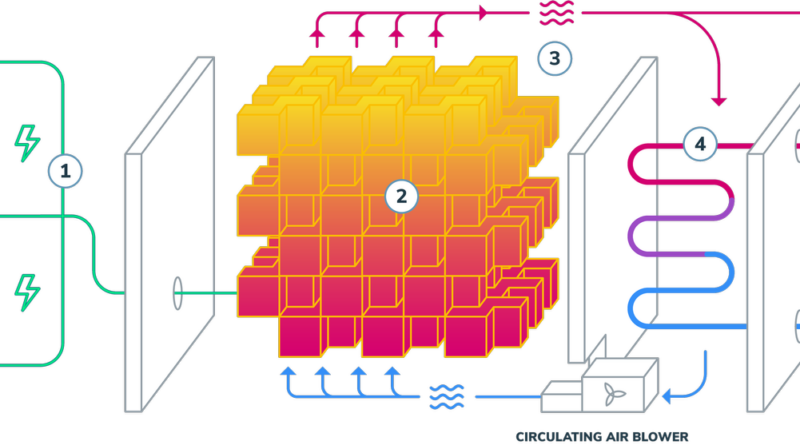 The bricks are containerized to enable heat to build up during the charging part of the process. When needed, blowers transfer the superheated air to its use point (see the CleanTechnica’s Rondo archive here).