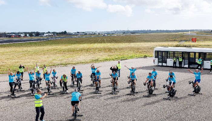 Believed to be Europe’s first spin class held on an active airport airfield, the fundraiser took place on Friday 26 September. Set against the backdrop of a live runway, participants pedalled through a near hour-long session while aircraft and helicopters continued to take off and land.