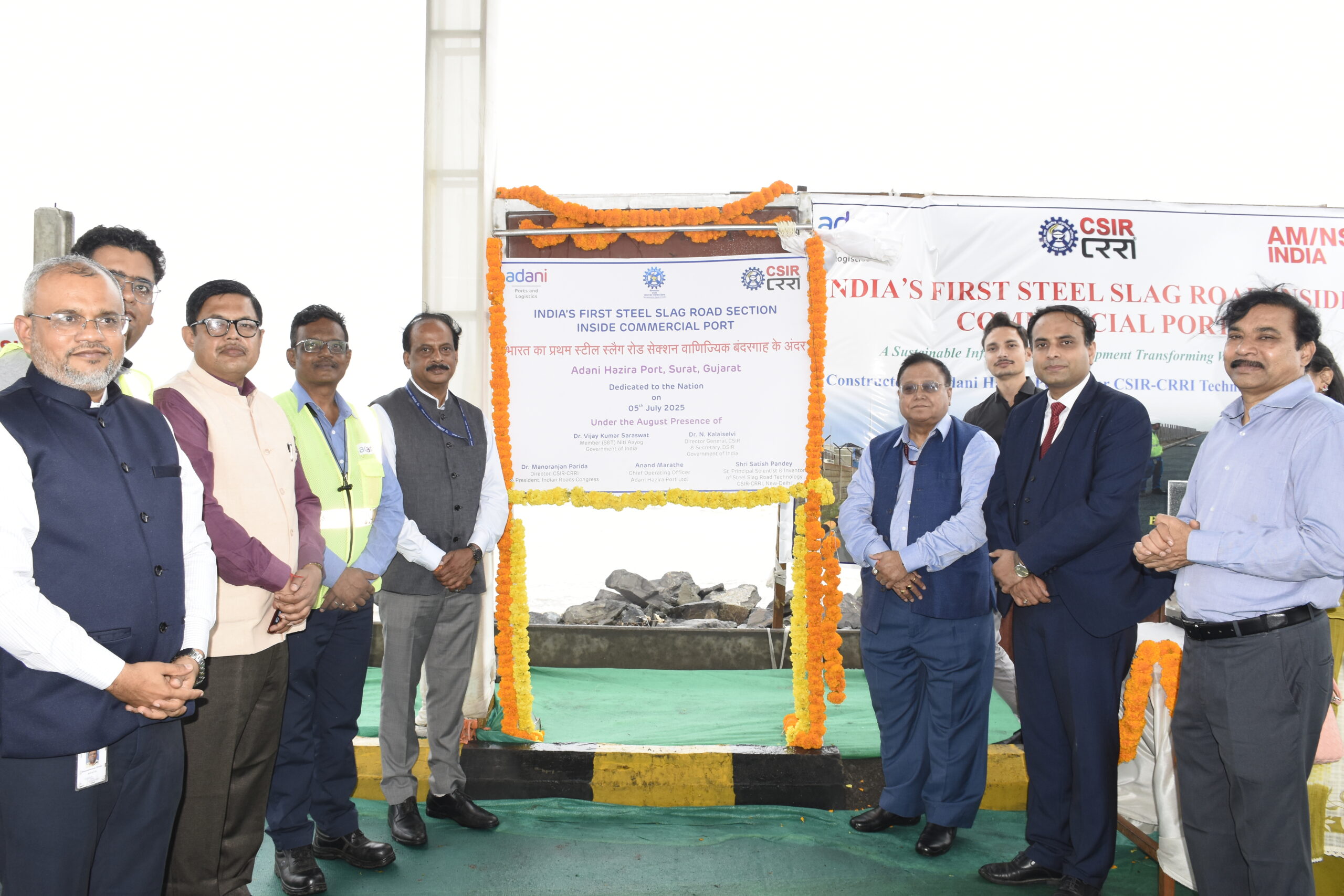 The road was formally inaugurated at Hazira Port by Dr Vijay Kumar Saraswat, Member (Science & Technology), NITI Aayog, in the presence of Dr N. Kalaiselvi, Director-General, CSIR & Secretary, DSIR, and Dr Manoranjan Parida, Director, CSIR-CRRI & President, Indian Roads Congress. Also present were Satish Pandey, Senior Principal Scientist and inventor of steel slag road technology, Anand Marathe, COO, Adani Hazira Port Ltd., and other dignitaries and scientists.