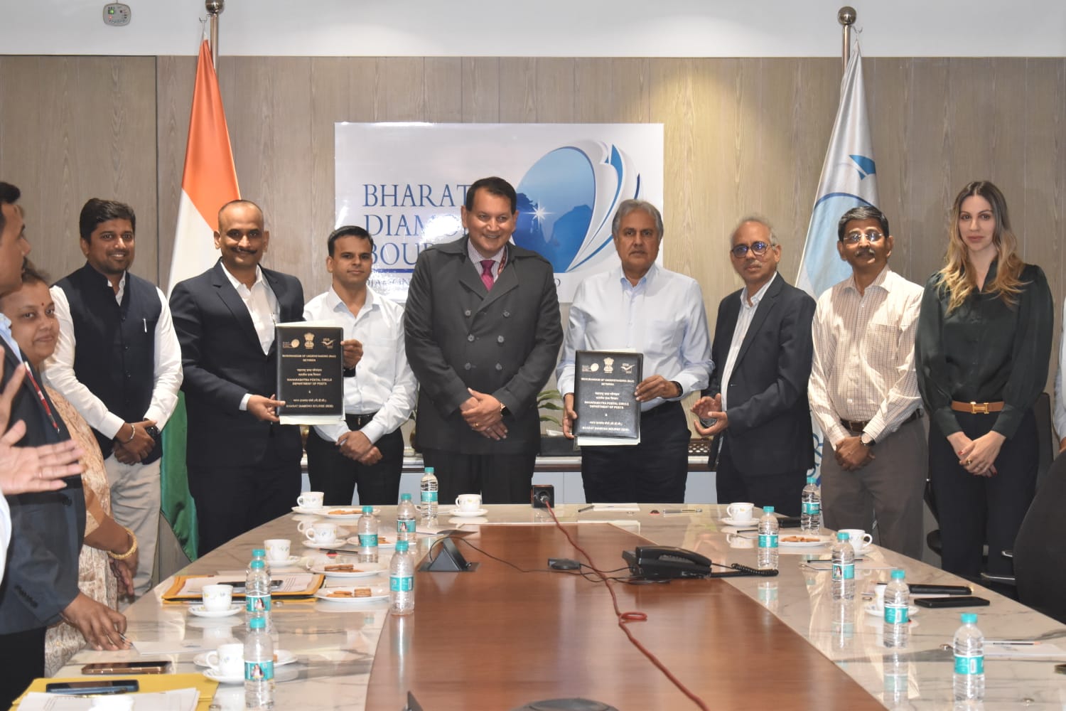 NEW DELHI : The Department of Posts (DOP), Maharashtra Circle, and BDB (BHARAT DIAMOND BOURSE) entered into a Memorandum of Understanding (MOU) on Tuesday, to establish a partnership aimed at offering various postal services for precious cargo to BDB. The MOU was signed by Shri Pandurang Chormale, Senior Superintendent of India Post, and Shri. Anoop Mehta, President, Bharat Diamond Bourse, in the presence of Shri. Amitabh Singh, Chief PMG Maharashtra Circle.