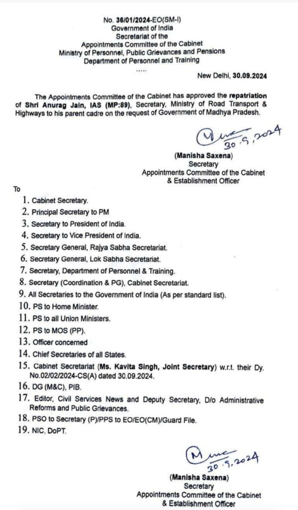 The Appointments Committee of the Cabinet (ACC) has transferred Anurag Jain, IAS (MP:89), Secretary, Ministry of Road Transport & Highways (MoRTH) to Madhya Pradesh, his home cadre on the request of Government of Madhya Pradesh. Given below is the order to this effect for the benefit of the viewers of www.indianpsu.com