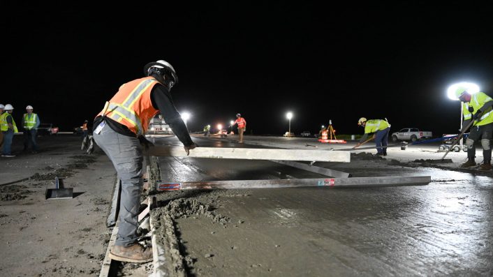U.S. Army Corps of Engineers and members of a contracted construction company pour concrete onto the runway at Ellsworth Air Force Base, S.D., Jun. 18-19, 2025. (Image credit: USAF/Airman 1st Class Alec Carlberg)