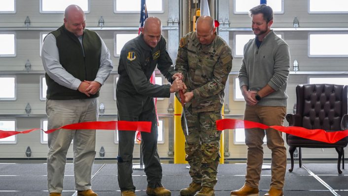 U.S. Air Force Col. Erick Lord, (left), 28th Bomb Wing commander, and U.S. Army Col. Robert Newbauer cut a ribbon during a ribbon cutting ceremony at Ellsworth Air Force Base, S.D., Dec. 3, 2025. (Image credit: USAF/Airman 1st Class Alec Carlberg)