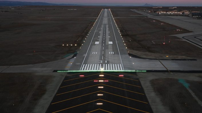 The airfield lights are powered on and tested during the upgrading of the runway at Ellsworth Air Force Base, S.D., Nov. 26, 2025. The reconstruction project prepares the airfield for incoming B-21 Raider operations. (Image credit: USAF/Airman 1st Class Alec Carlberg)