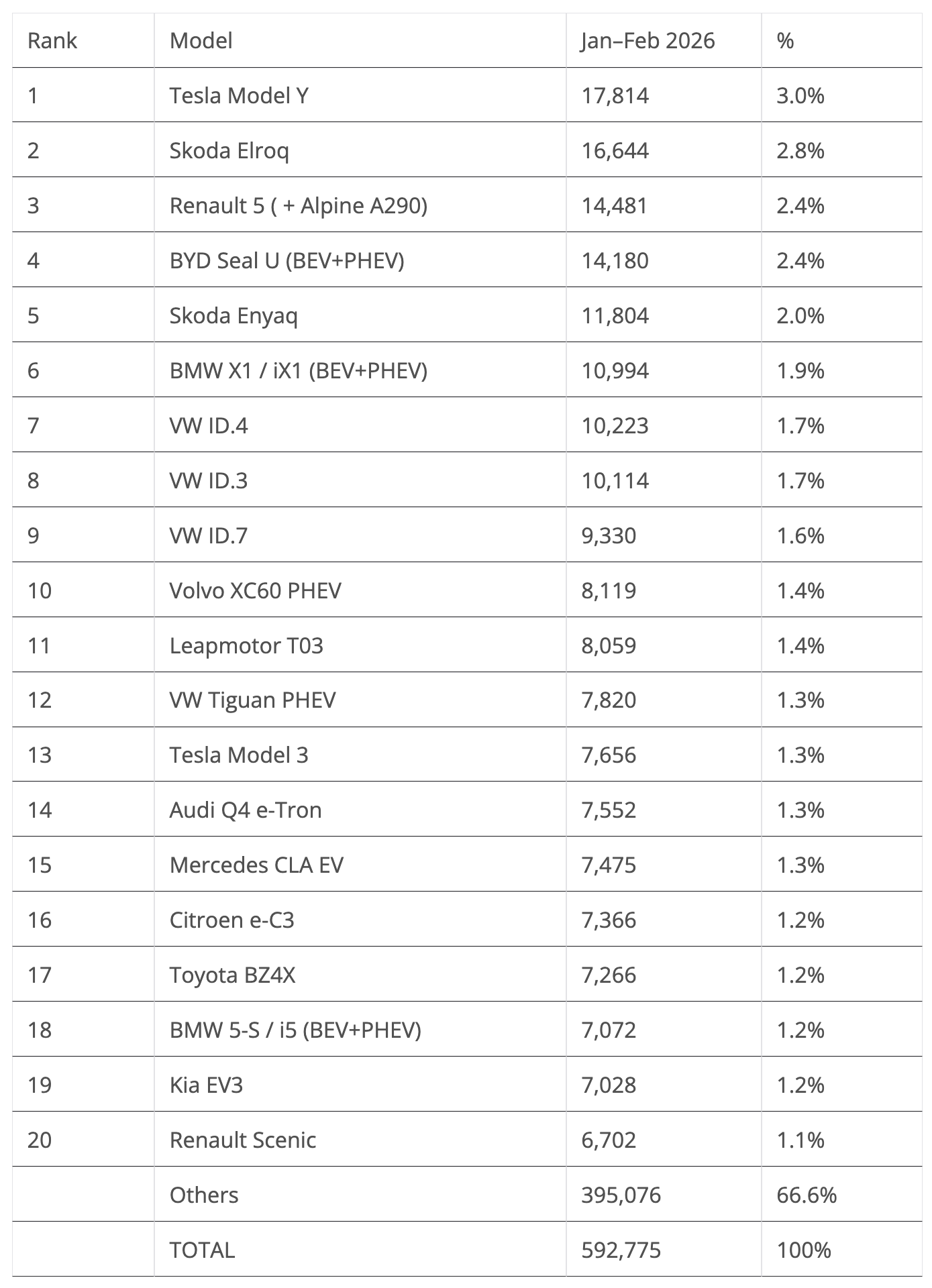 Outside the top 20, the highlight goes to the fact that the BYD Dolphin Surf (euro-spec Seagull) ended the month at #21, just 13 units from the #20 Kia EV3. If BYD’s smallest EV had joined the table, it would mean that BYD would have placed three representatives in the top 20, something that only Volkswagen managed to do.