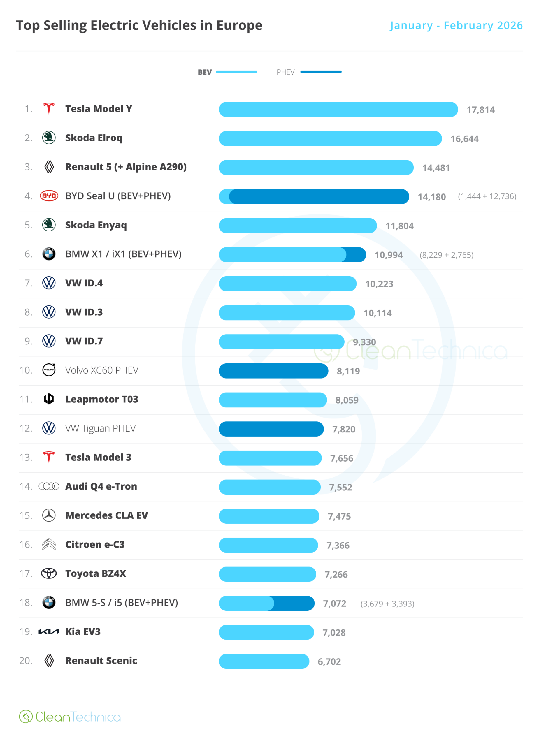 Third placed BYD saw its share rise by 0.1% in February, from 6.8% to 6.9%, and is now just 0.2% share behind the runner-up BMW, so March might bring BYD climbing into the #2 position! Then the Shenzhen make would only need to focus on going after Volkswagen to take the best seller title … in Europe!