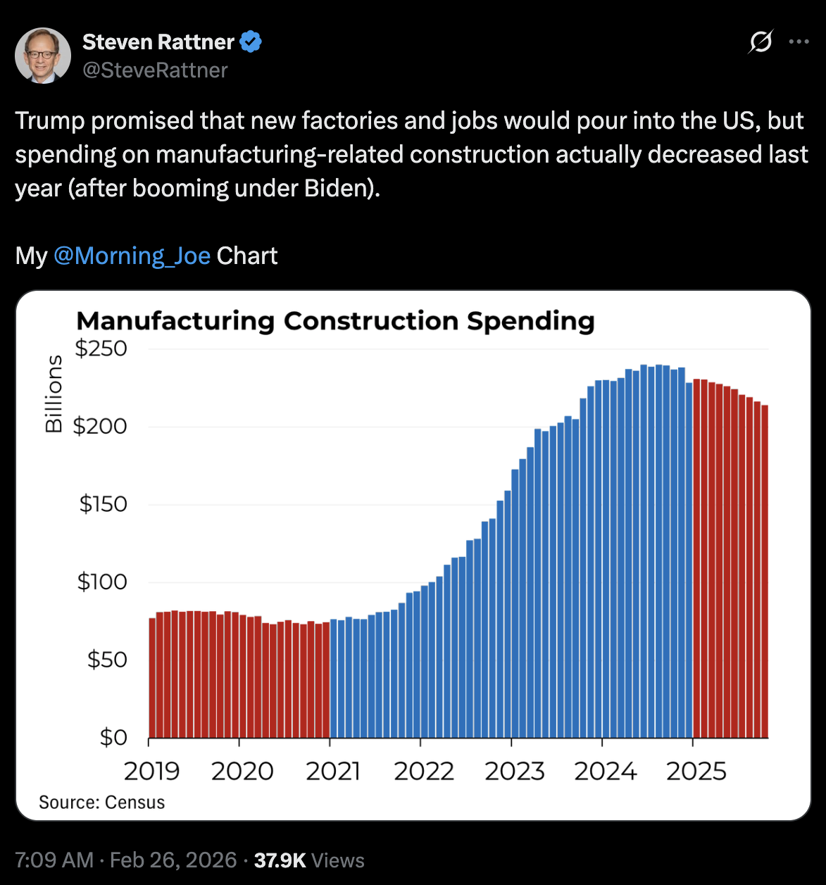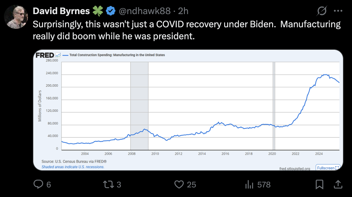 Indeed, in the following years, US manufacturing construction rose enormously, approximately tripling from 2021 to 2024. This is not an abstract “well, it could be this or it could be that” matter. The Green New Deal, which actually also included the Bipartisan Infrastructure Law (which was really not that bipartisan in Congress, even if its elements were among the normal public), was very focused on stimulating a much bigger manufacturing economy for the core energy and tech industries of the 21st century. And these industries responded.