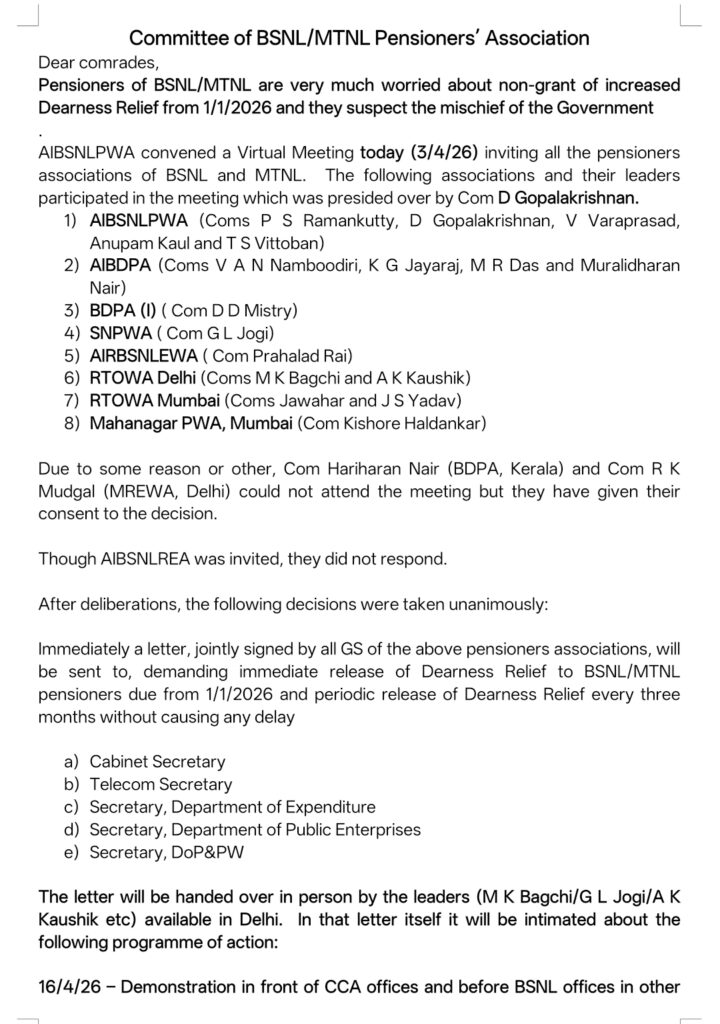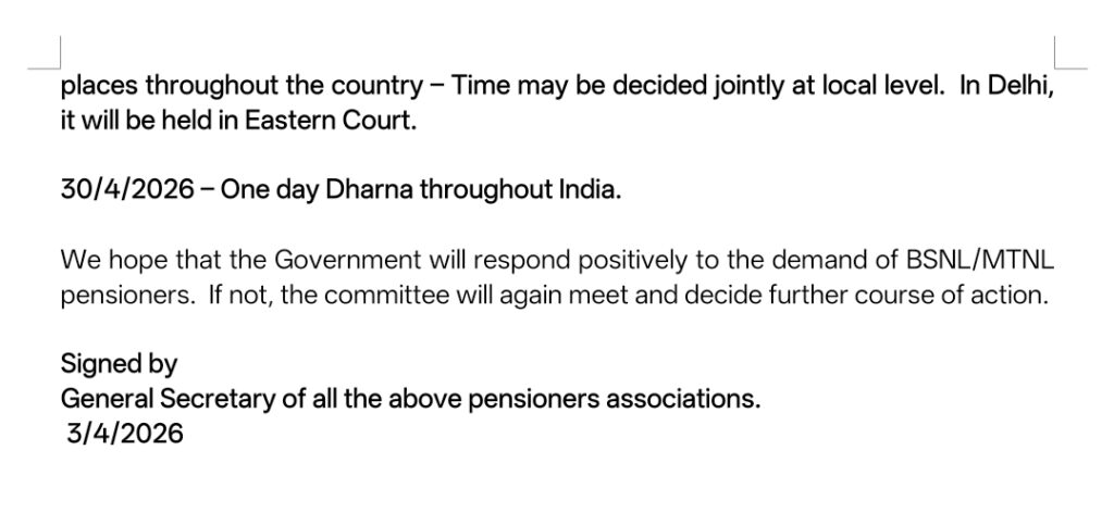 Expressing deep concern over the non-release of increased Dearness Relief (DR) effective January 1, 2026, pensioners of BSNL and MTNL have come together under a joint platform, alleging possible government inaction. In a unified move, multiple pensioners’ associations resolved to intensify their protest through coordinated demonstrations and a nationwide dharna, while simultaneously pressing top government authorities for immediate intervention and timely disbursement of pending DR dues.