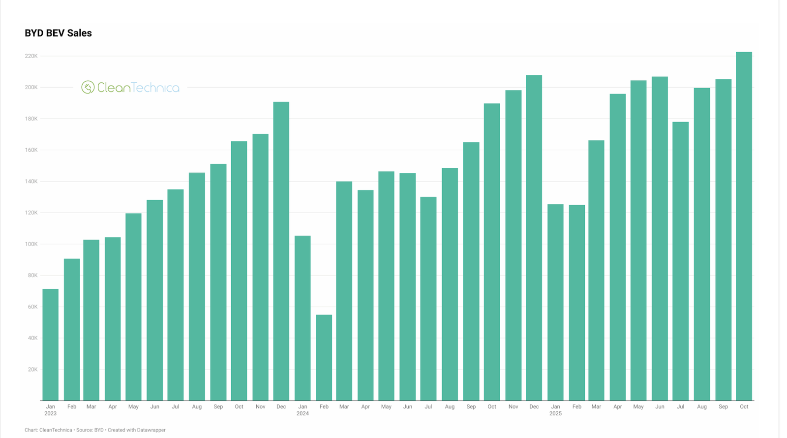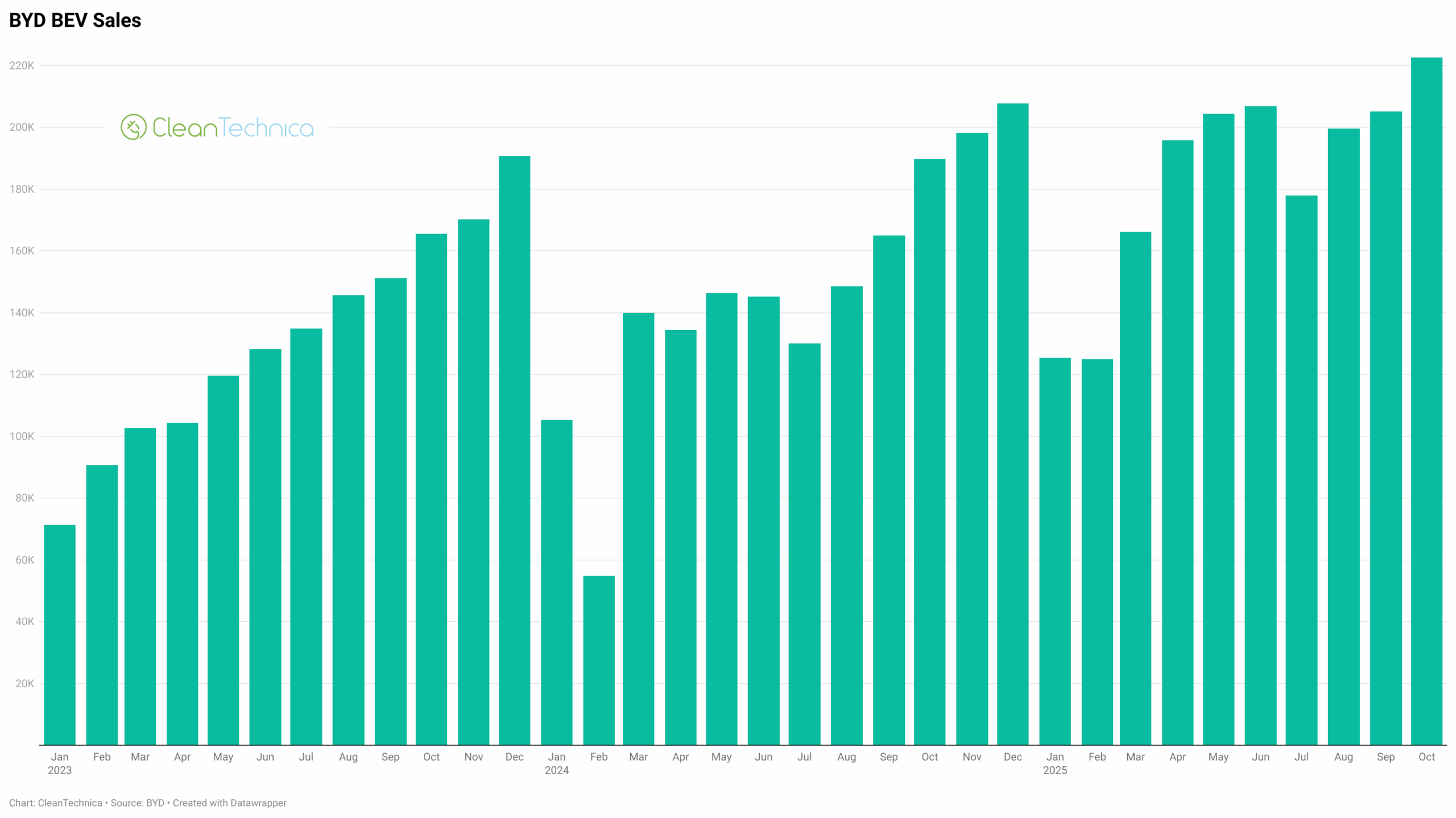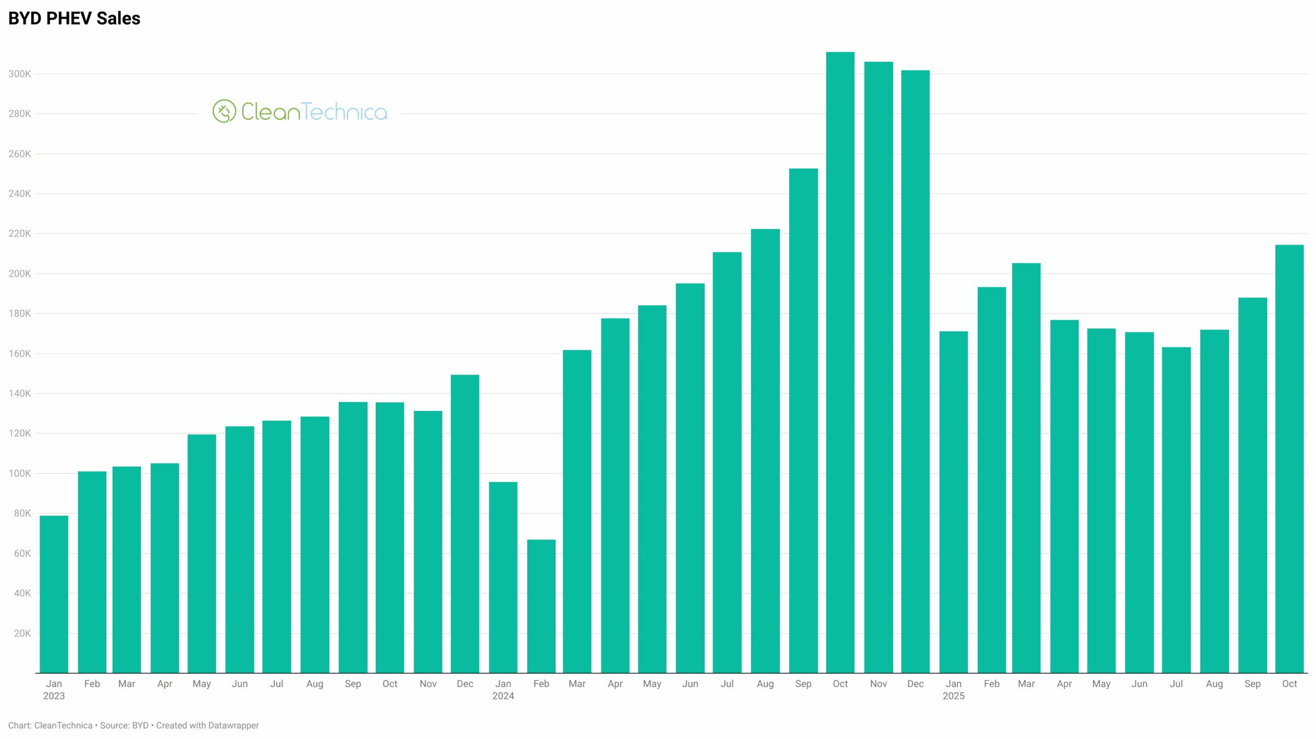 Plugin hybrid electric vehicle (PHEV) sales, on the other hand, were down significantly. They dropped 31% year over year. All combined, then, BYD’s plugin passenger vehicle sales were down 12.7% compared to October 2024.