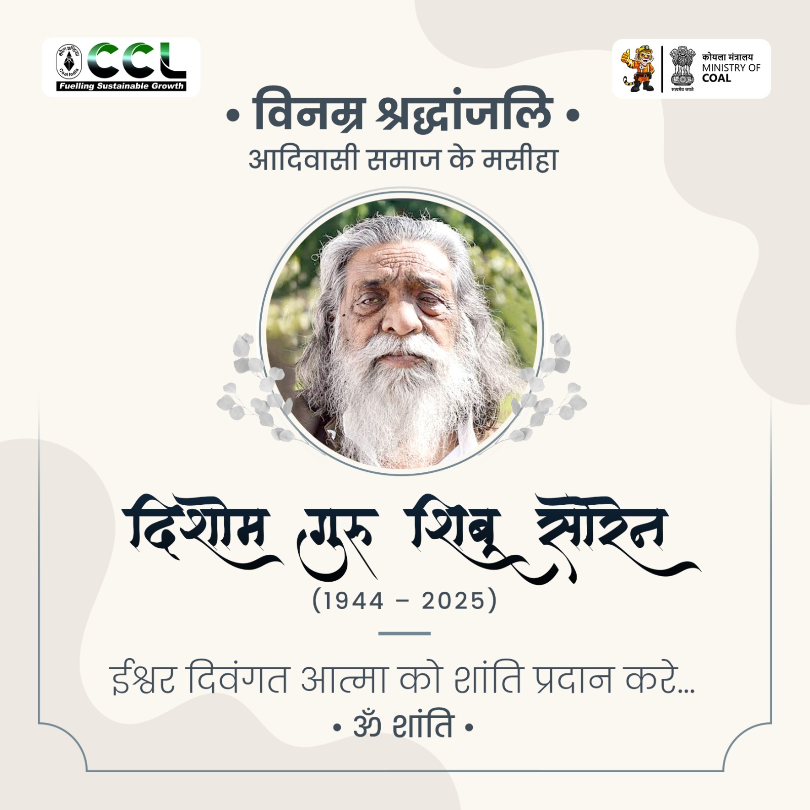 In a moment of profound grief for the state of Jharkhand and the entire nation, the Central Coalfields Limited (CCL) family deeply mourns the demise of Dishom Guru Shibu Soren Ji—a revered leader of tribal society, former Union Coal Minister, three-time Chief Minister of Jharkhand, and sitting Rajya Sabha Member of Parliament. His passing marks an irreparable loss to the social, political, and cultural landscape of the country.