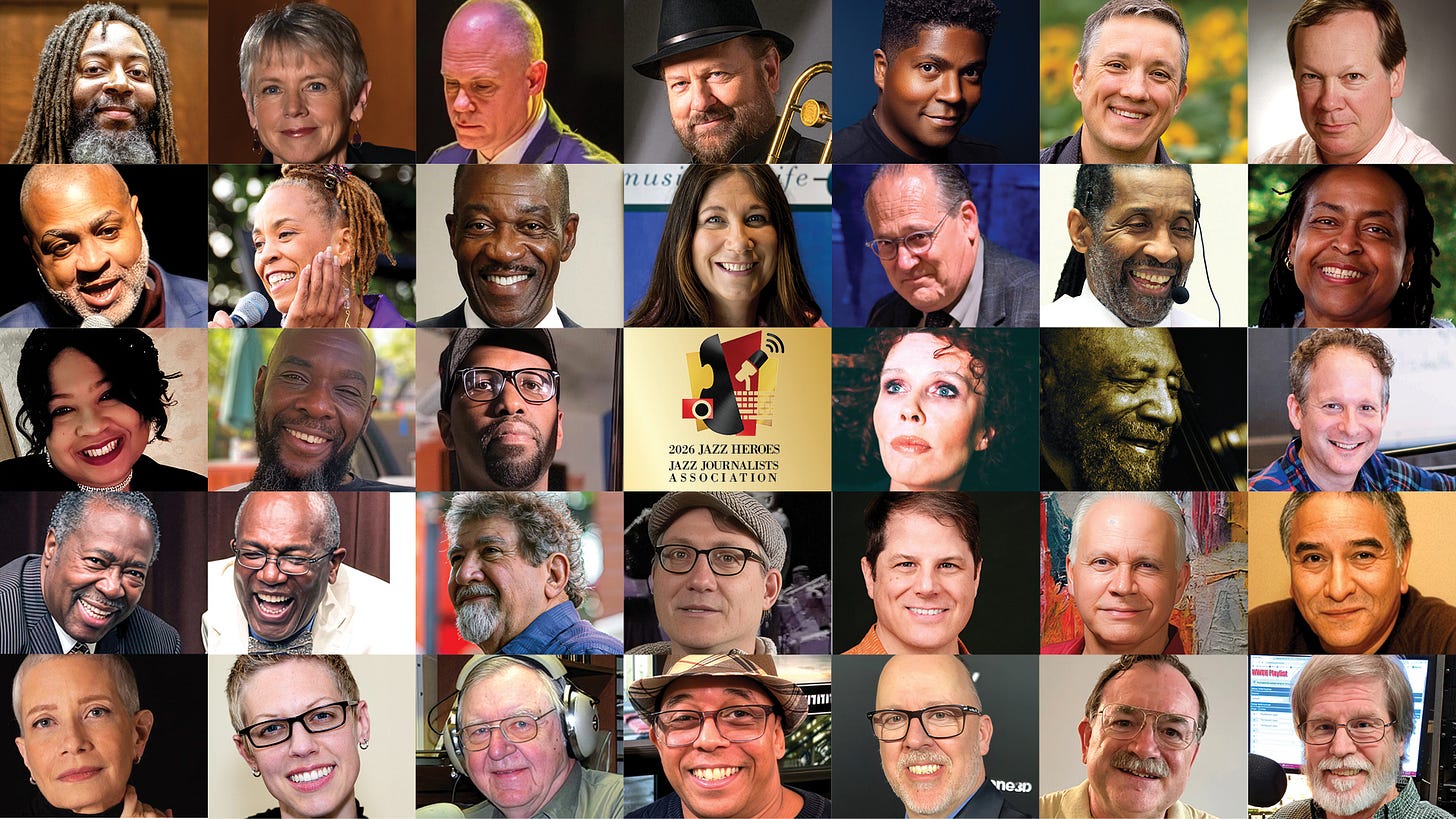 I’ve formally retired from presiding over the JJA, but am deeply involved in promoting this campaign, hoping to remind people all over — general audiences! — that jazz is near them/us, presented by our neighbors, taught and sung and lived by devotees virtually everywhere. The JJA’s 34 2026 Jazz Heroes. are grassroots culture workers from 32 locales (including, for the first time, London). Their portraits and personality profiles are at JJAJazzAwards.org/2026-jazz-heroes. Among them: