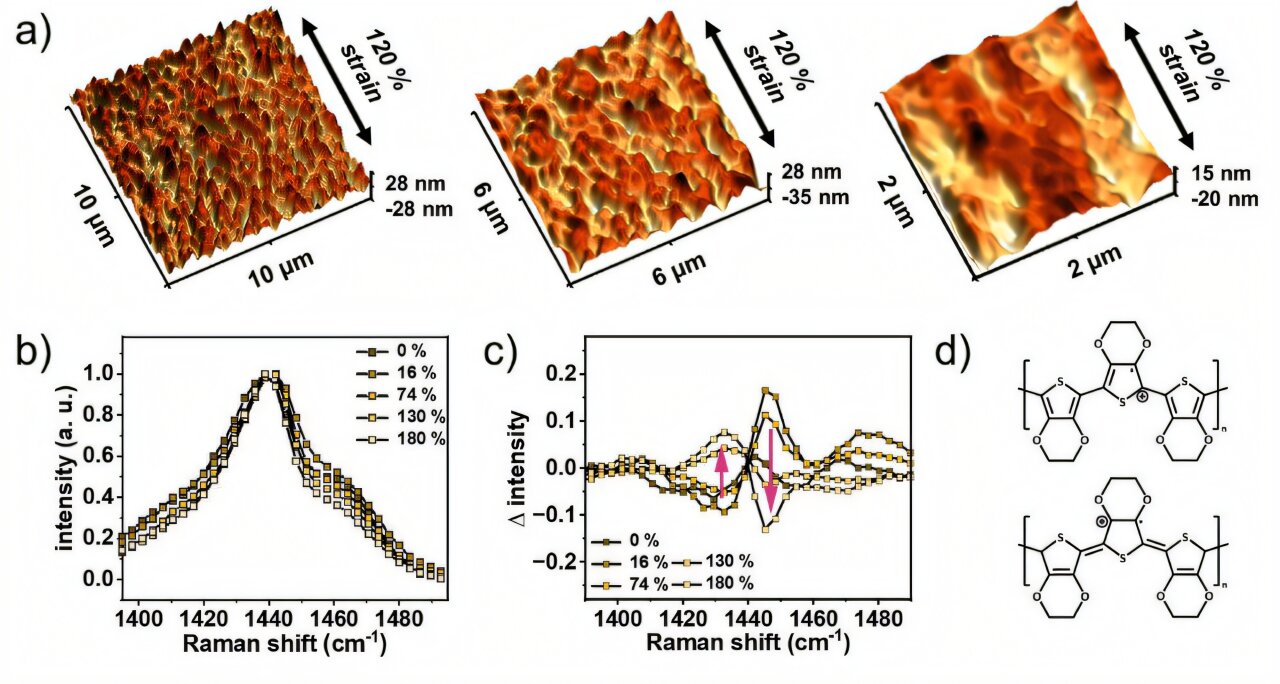 The approach furthermore enables fundamental insights into the behavior of stretchable electronic materials. Combining various analytical methods—including electrical characterization, microscopic imaging, atomic force microscopy, and Raman spectroscopy—the researchers were able to gain new insights into the morphological and electronic changes of PEDOT:PSS under strain.