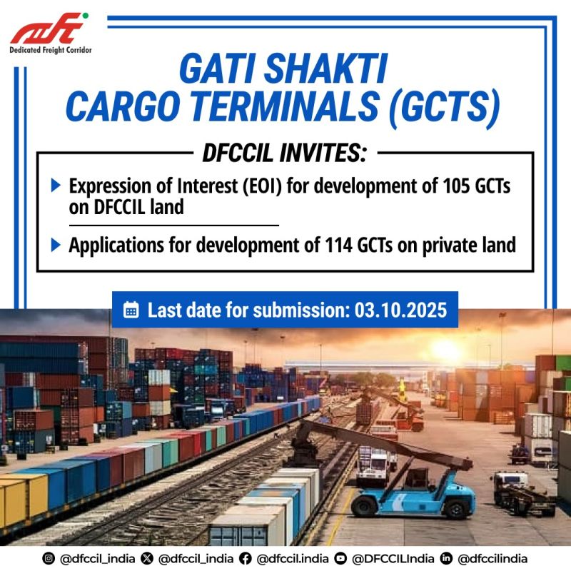 Aimed at revolutionizing multimodal logistics across the country, this initiative focuses on enhancing high-capacity freight infrastructure along the Dedicated Freight Corridors (DFCs). DFCCIL is welcoming Expressions of Interest (EOIs) for setting up GCTs both on DFCCIL-owned land and on private land, paving the way for efficient, modern, and integrated cargo handling facilities.