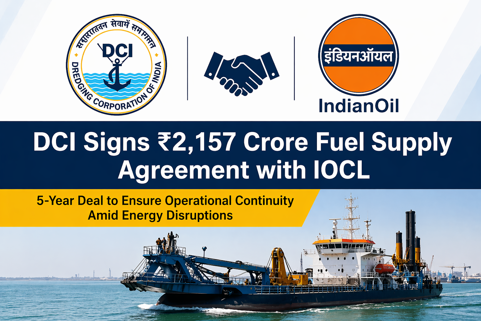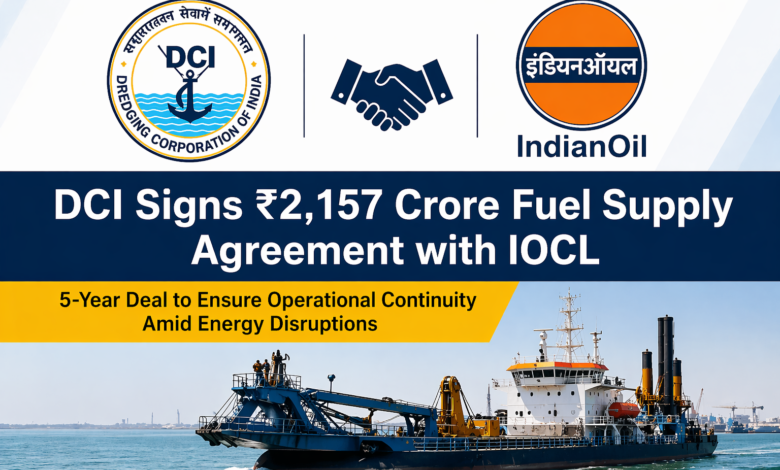 Dredging Corporation of India has signed a Memorandum of Understanding (MoU) worth ₹2,157 crore with Indian Oil Corporation Limited for a five-year fuel supply, strengthening operational continuity amid ongoing energy sector disruptions.