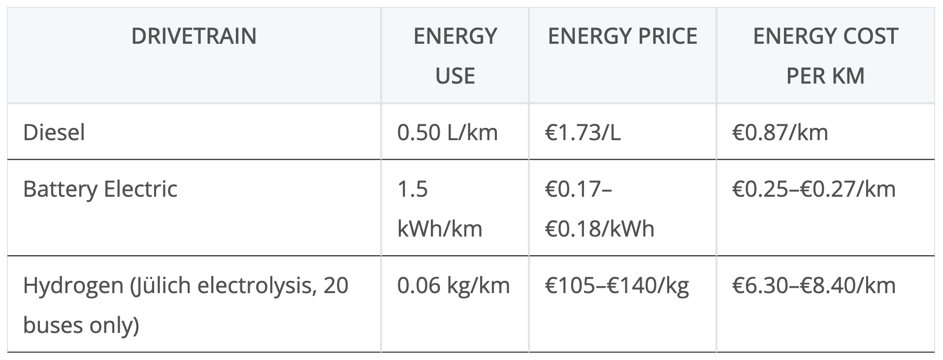 Emissions tell a more nuanced story. Diesel buses at 0.5 L per km and 2.65 kgCO2 per litre emit about 79.5 tons CO2 per year at 60,000 km. Battery electric buses at 1.5 kWh per km on Germany’s 2023 average grid intensity of 380 gCO2 per kWh emit about 34.2 tons per year. Gray hydrogen produced from natural gas at about 11 kgCO2 per kg H2 yields about 41.7 tons from hydrogen production per bus year. With 5% hydrogen leakage and a GWP100 of 11.6, leakage adds about 2.2 tons, bringing the total to about 43.9 tons per year. Using a GWP20 of 37.3 raises leakage impact to about 7 tons and total to about 48.8 tons per year. If Jülich electrolysis runs on the average German grid instead of certified renewable power, the emissions are higher. Fifty five kWh per kg at 380 gCO2 per kWh, just the electrolysis, yields about 20.9 kgCO2 per kg H2. At 3,600 kg per year that is roughly 75 tons from electricity alone. Including 5% leakage raises that to 81 to 86 tons per year depending on GWP horizon. In that case hydrogen is roughly on par with diesel in operational emissions. At 65 kWh to accommodate balance of plant, compression and recompression, it’s over 100 tons CO2e for electrolysis, well above diesel.