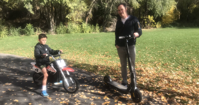 And we know by now, scooters are not just for kids, as we see rental e-scooters like the one below left all over cities. See also a young boy below on a powerful e-motorcycle.