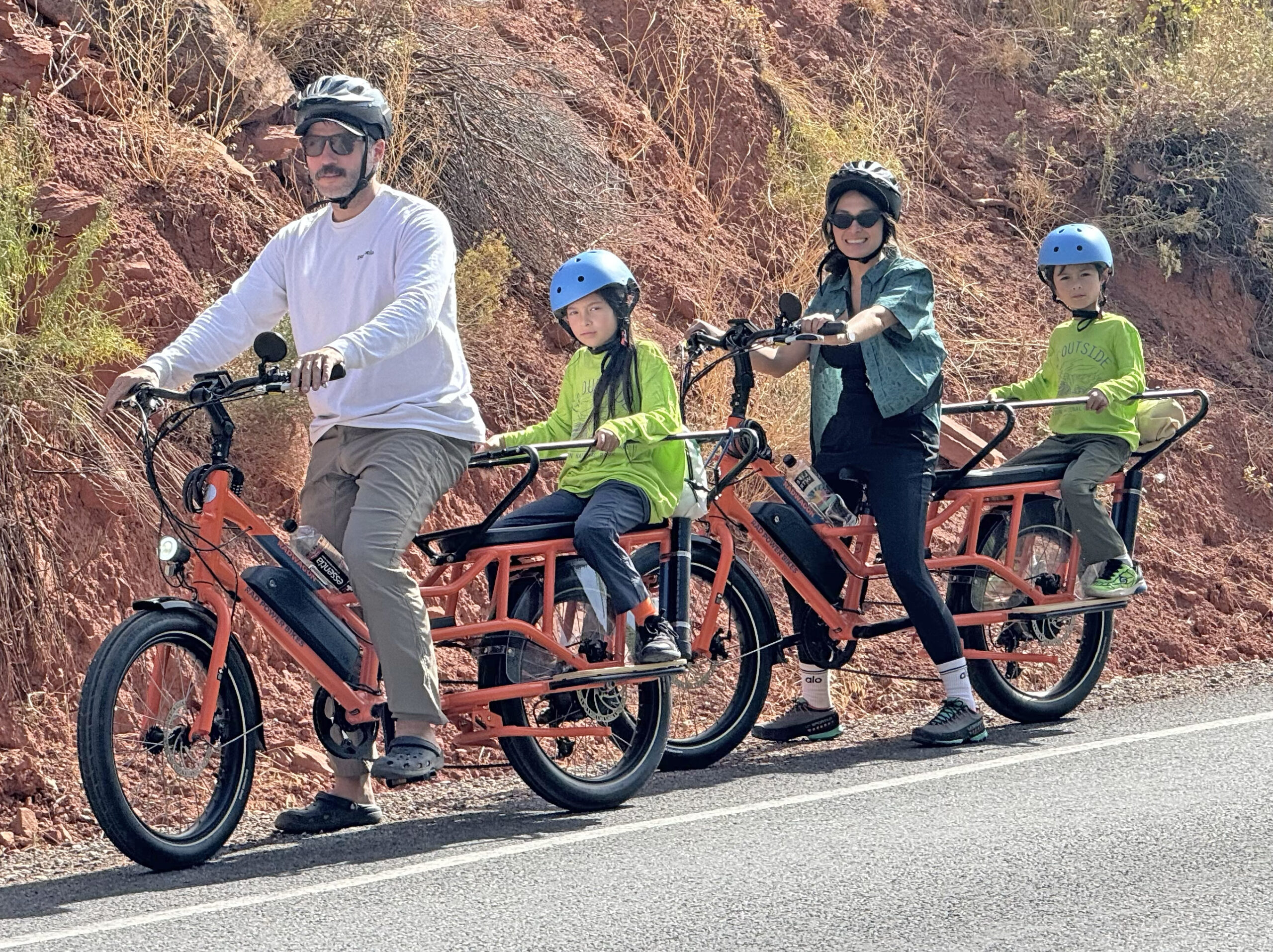 Traditionally, scooters were a kids’ toy and e-bikes were for adult transportation and recreation. However, with the advent of powerful batteries and electric motors there has been a revolution in what is possible for both recreation and transportation. In the photo above, we see innovation in how a parent can go for a ride, or do an errand to the grocery store, with two kids. I see this as a person with a need and coming up with an innovative solution. How do I get my kids out on a bike on a nice day and give them some riding practice at the same time? And what do I do if the kid gets tired? As a bonus, this is a green solution.