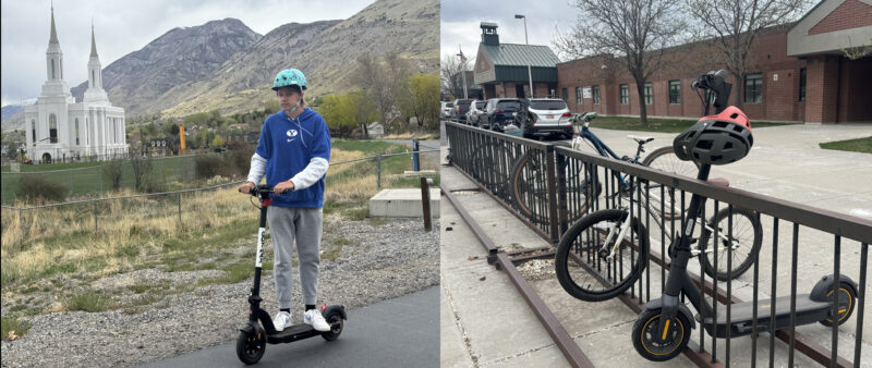 The pink scooter is a knockoff on the Vespa scooters that I first saw as a kid in Germany in 1955. You don’t think of children as part of e-mobility, but these are not just toys. When I pick up my grandson at Grove Crest Elementary School in Pleasant Grove, Utah (see below), I saw several kids running to the bike rack to pick up their e-scooters and e-bikes and heading off home. They are saving a trip in the family, SUV or minivan — probably gas-powered.