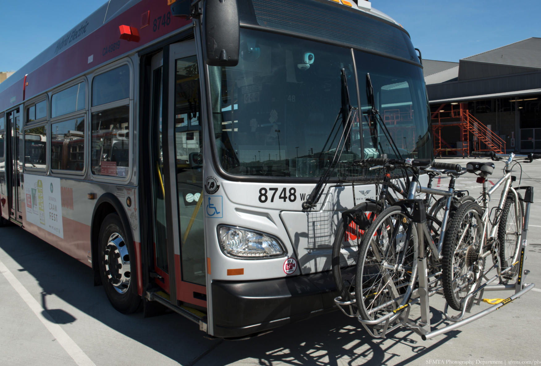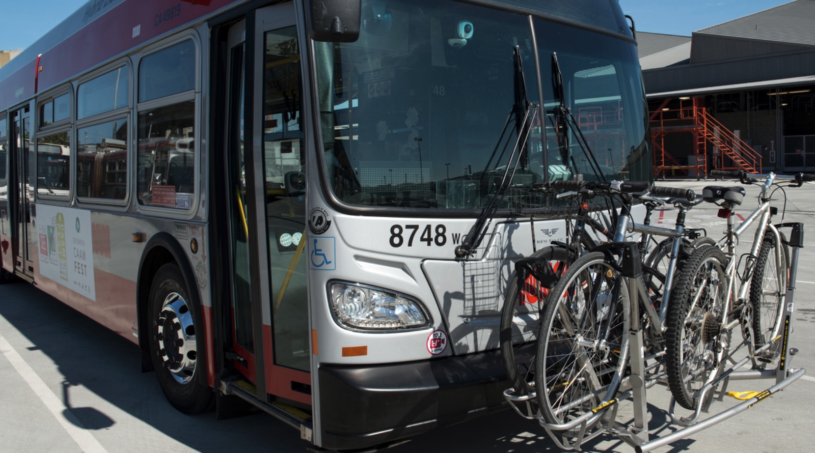 - Bus: Many city buses these days have bike racks on the front (see photo below), so bikes can be used for last-mile transportation with buses.
