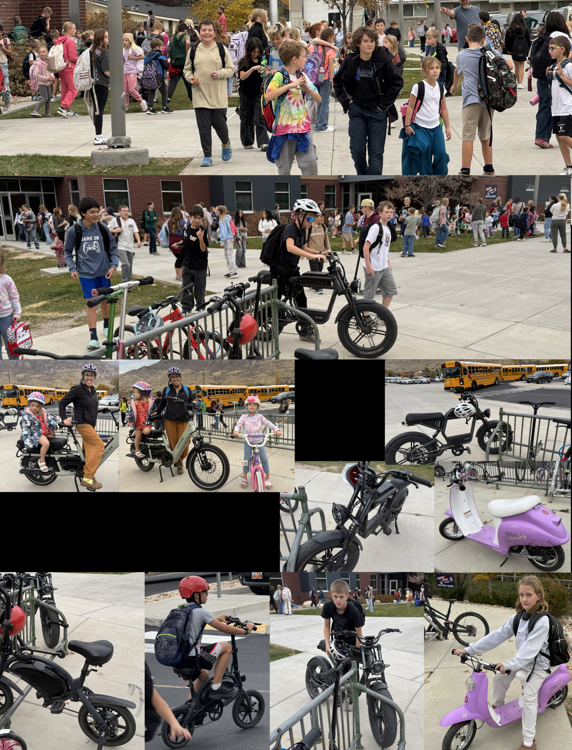 - Transport to and from school by children and parents: I go to an elementary school frequently to pick up my grandson. You see the activity below of kids leaving on ebikes and escooters and a mother on an ebike picking up her child.