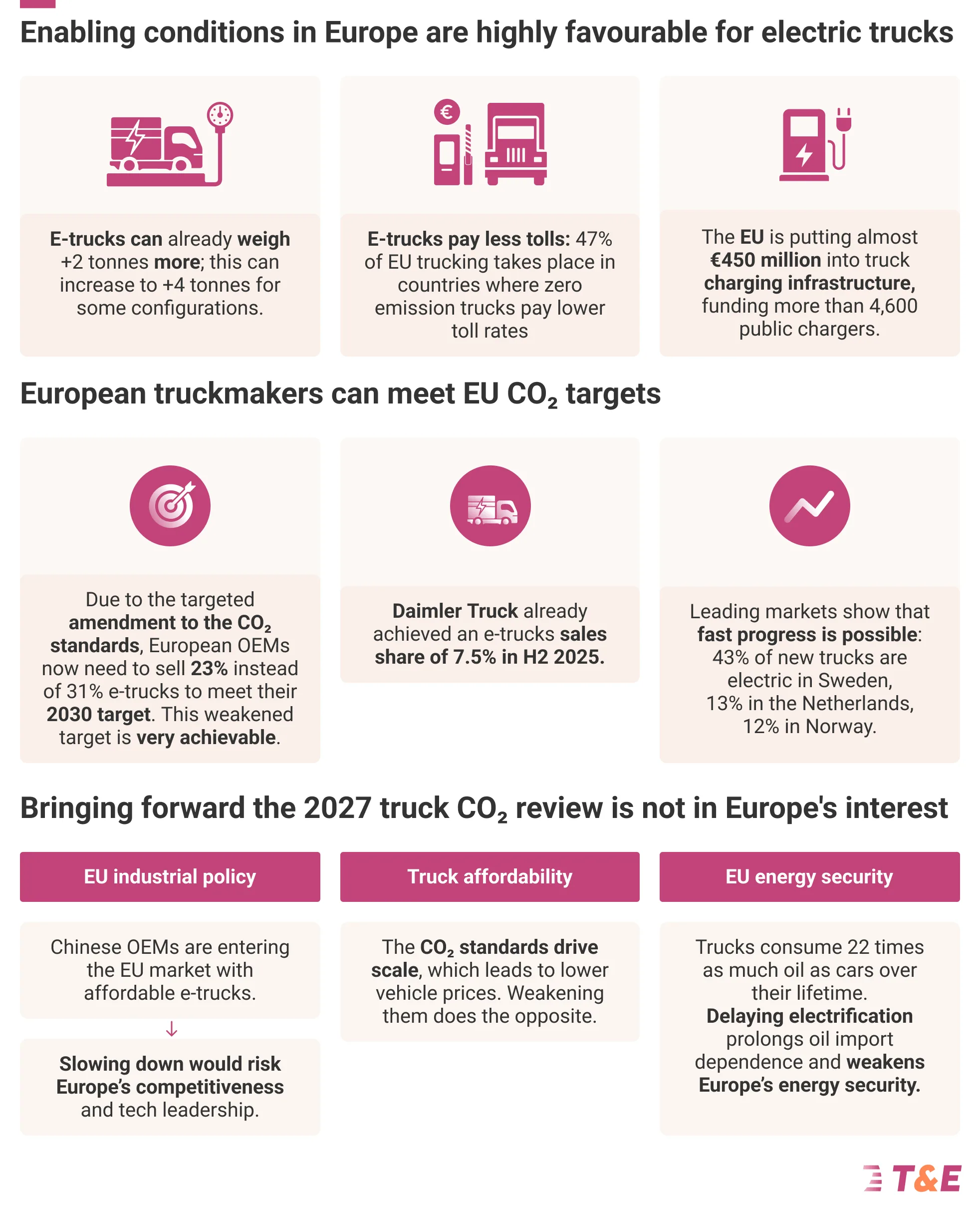 European truckmakers are calling on the European Commission to bring forward the review of the CO₂ standards for HDVs to 2026 rather than 2027 as set out in the legislation adopted in 2024. They argue that the required enabling conditions in the EU are not in place to generate sufficient demand for zero-emission trucks (ZETs) that Original Equipment Manufacturers (OEMs) need to sell to meet their 2030 CO₂ targets.