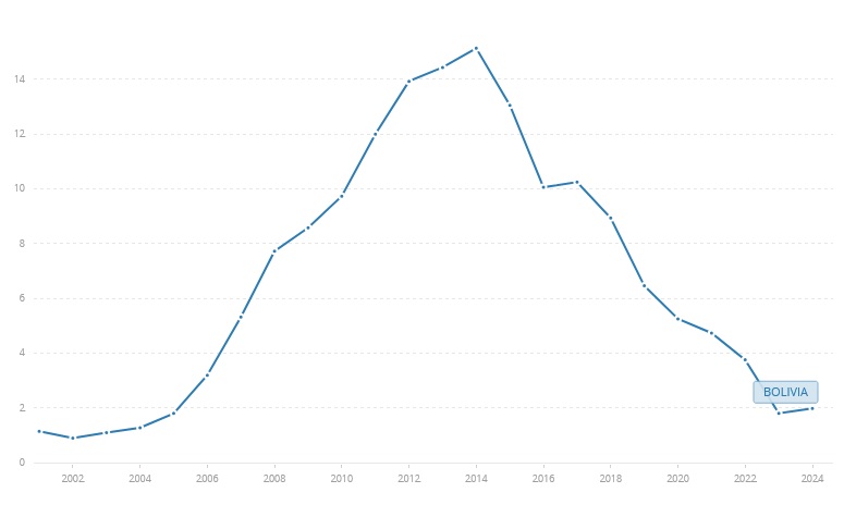 By 2024, Bolivia’s vehicle fleet had risen to over 2.5 million vehicles, though with a small presence now of EVs. Fuel had become scarce and lines had become common at gasoline stations. The economy stalled, with a 1.1% reduction that year, whereas the cost of gasoline subsidies rose over 2 million dollars, over 5% of its total budget, and only at the cost of decimating its reserves.