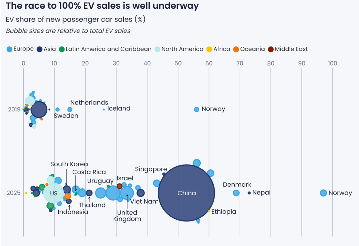 The report continues: “The analysis shows that the EV race has gone truly worldwide. There are now 39 countries where EVs make up more than 10 percent of new car sales, compared with just four in 2019. Much of the fastest growth is now happening outside Europe…. The Association of Southeast Asian Nations has become a major force in global EV adoption in 2025. Singapore and Vietnam have reached EV sales shares around 40 percent, overtaking levels seen in the UK and the EU.”