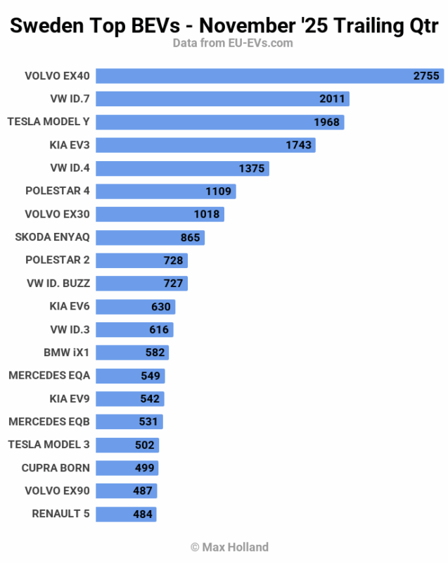 November’s auto sales saw plugin EVs at 65.4% share in Sweden, up from 61.7% year-on-year. BEVs were up in share, while PHEVs were flat. Overall auto volume was 21,016 units, down by some 15% YoY. The Volvo EX40 was the best-selling BEV.