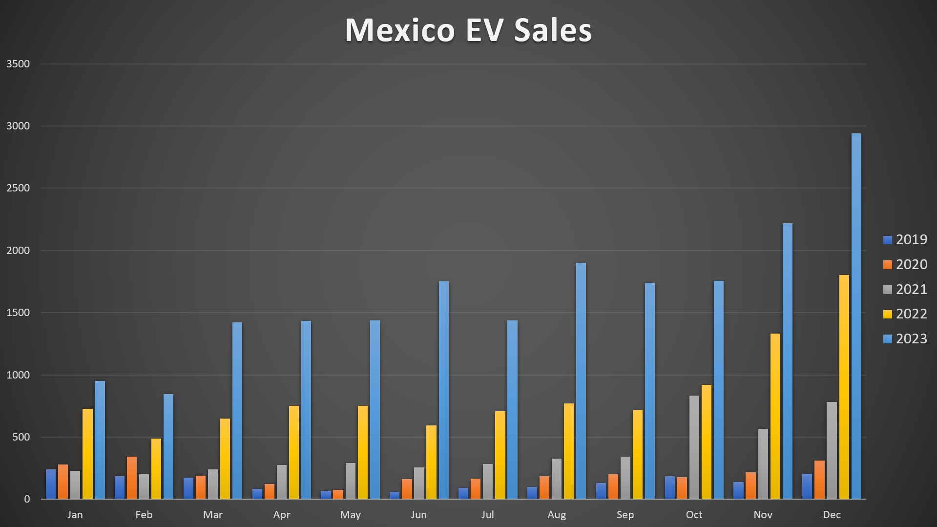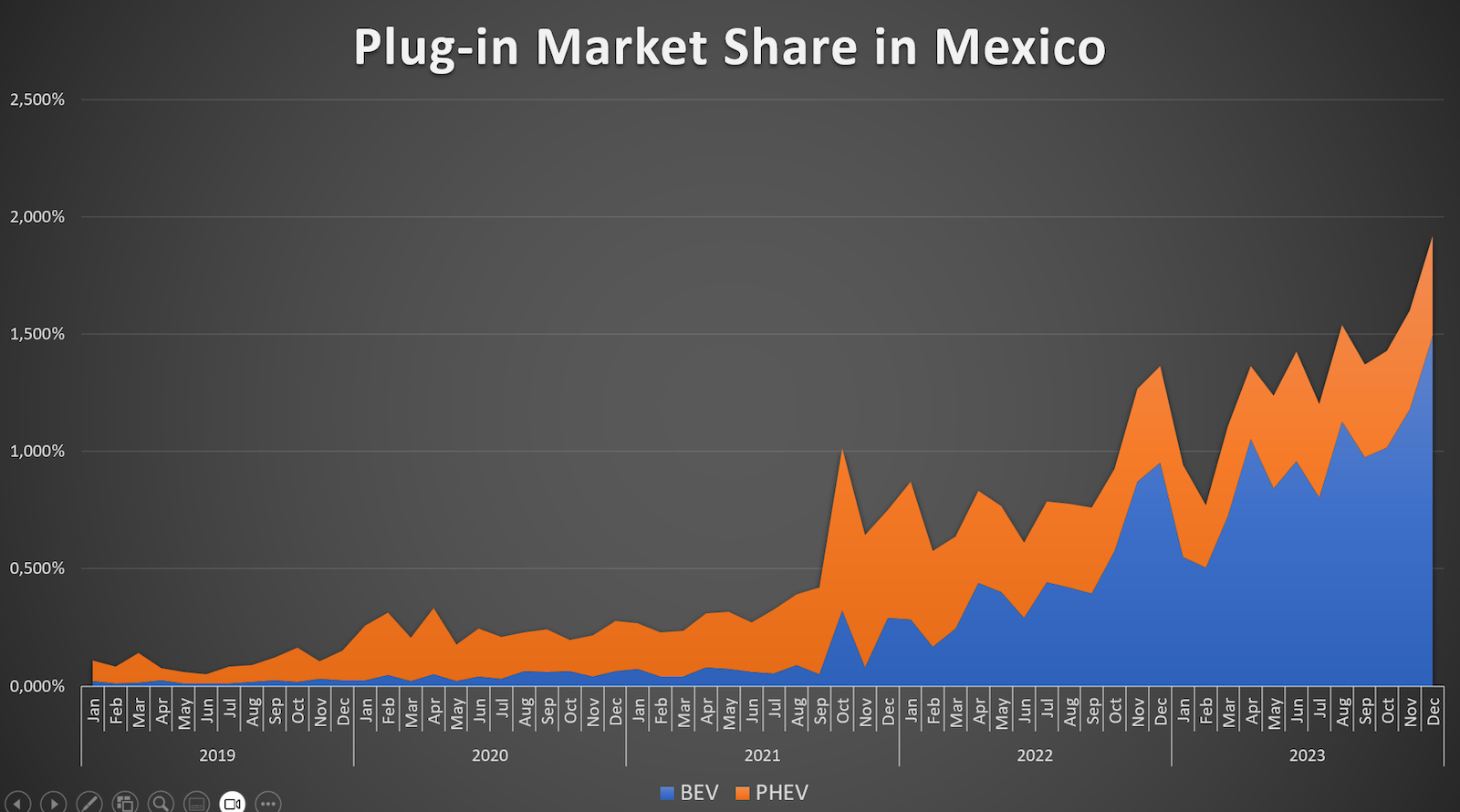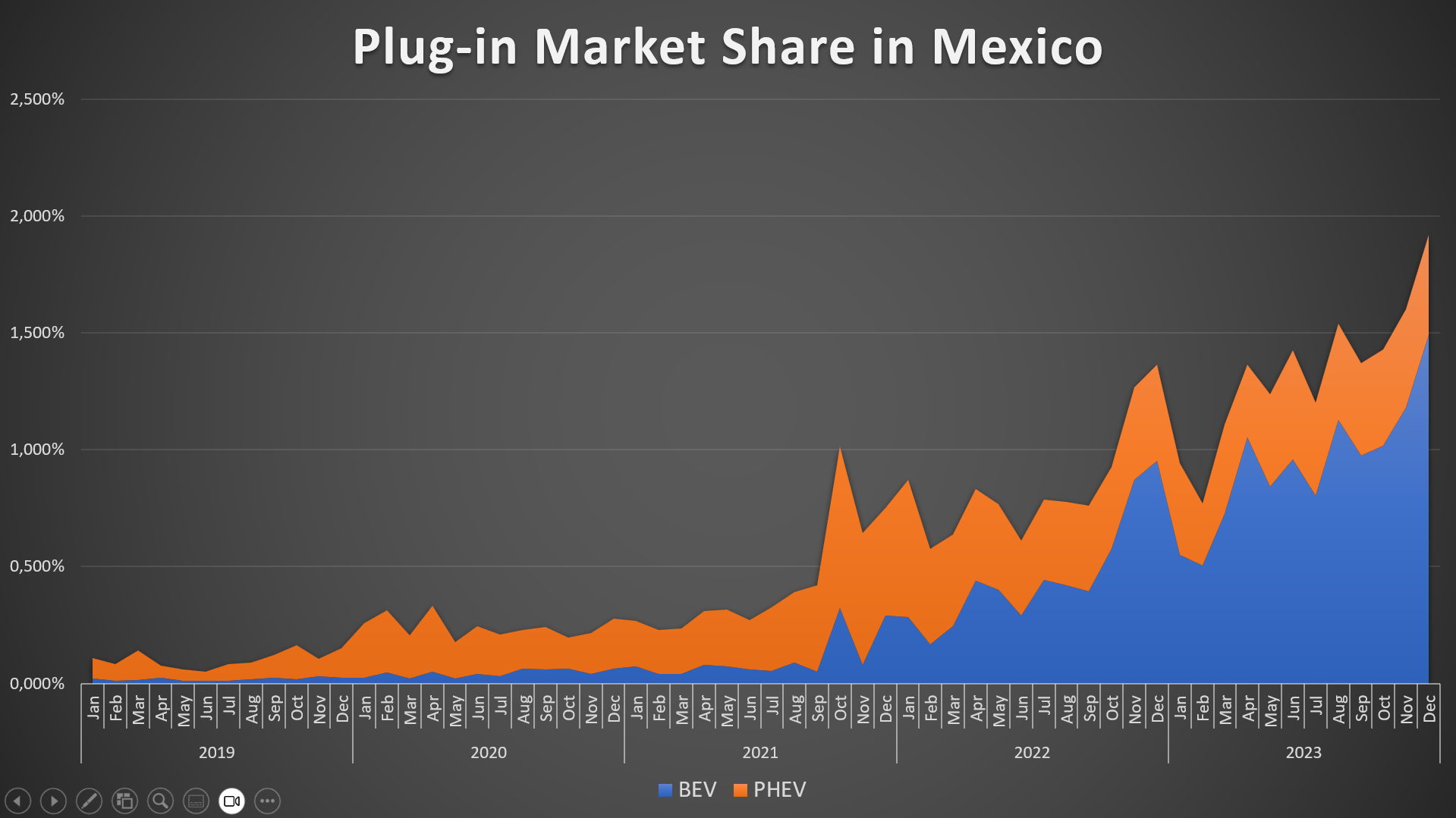 1,469,040 light and heavy vehicles were sold in Mexico in 2023. Of these, 19,487 were EVs (up 94% YoY), for only 1.3% EV market share. However, because sales ramped up substantially during the year, December 2023 closed at 2% (1.5% BEV), meaning the market is maturing very fast, with significant growth in only one year.