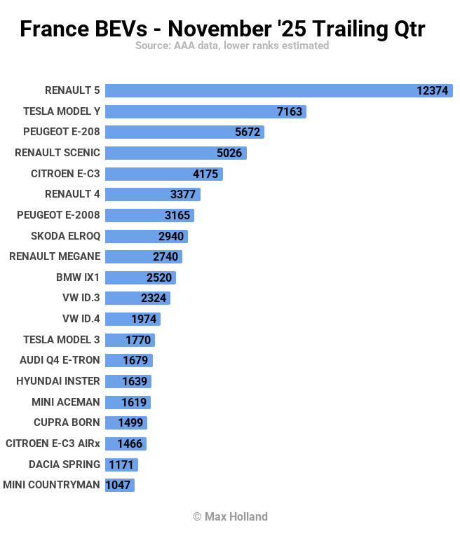 The Renault 5 dominates, well ahead of the Tesla Model Y and all other models. Its volume (at 12,374 units) has almost doubled since 3 months prior, and is almost a 3-month alltime record, only marginally topped by the Tesla Model 3’s volume in winter 2023.