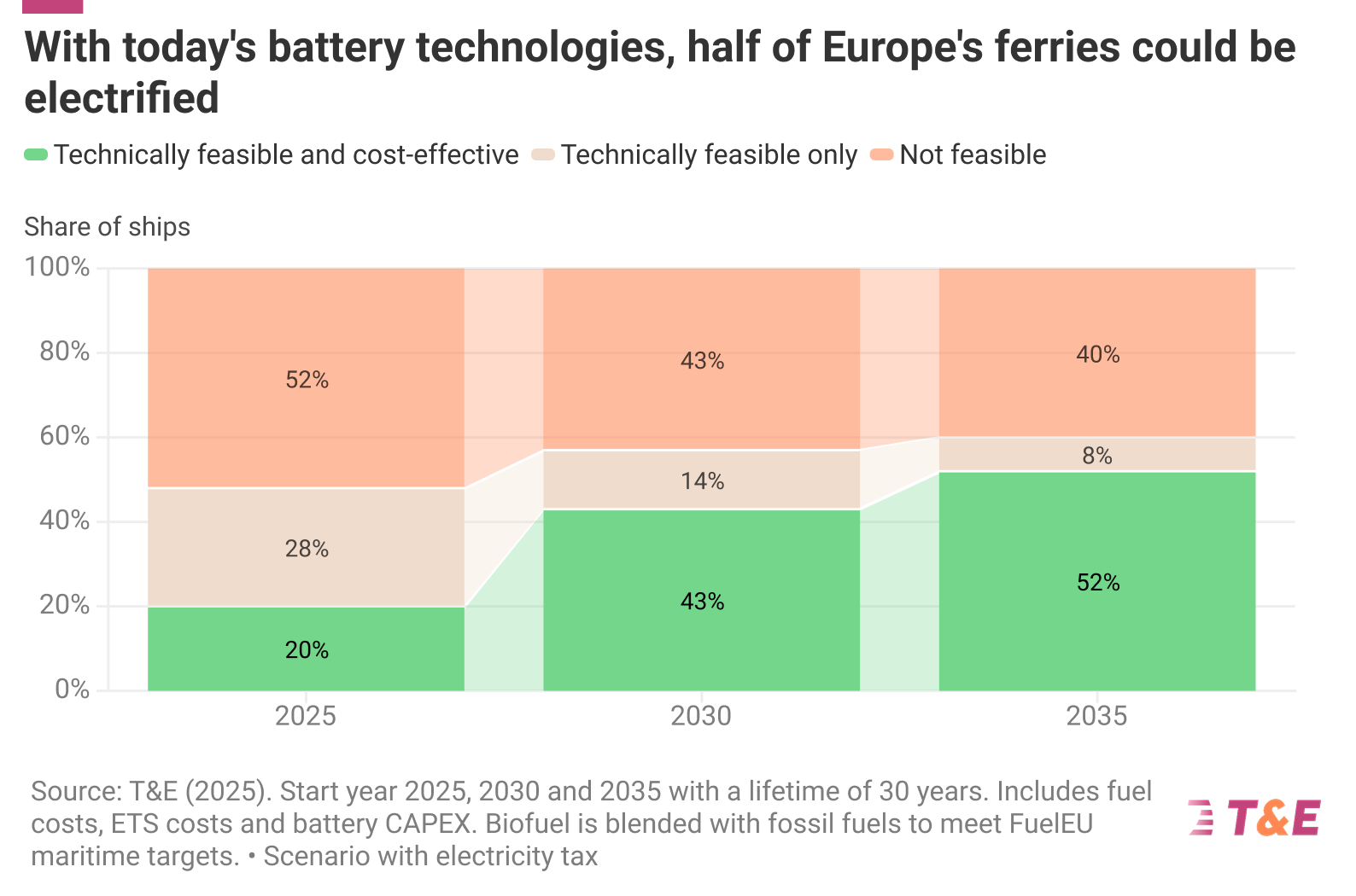 A shift to electric ferries offers a cost-competitive solution that is already starting to take off in Europe. Unlike other parts of the shipping sector, ferries are easy to electrify, given their smaller size and fixed routes. T&E finds that at least 60% of Europe’s ferry fleet could run on battery power by 2035, with many routes already cheaper to operate as electric today. Electrification and hybridisation could cut ferry CO₂ emissions by up to 42%, and improve air quality in port cities while reducing operating costs.