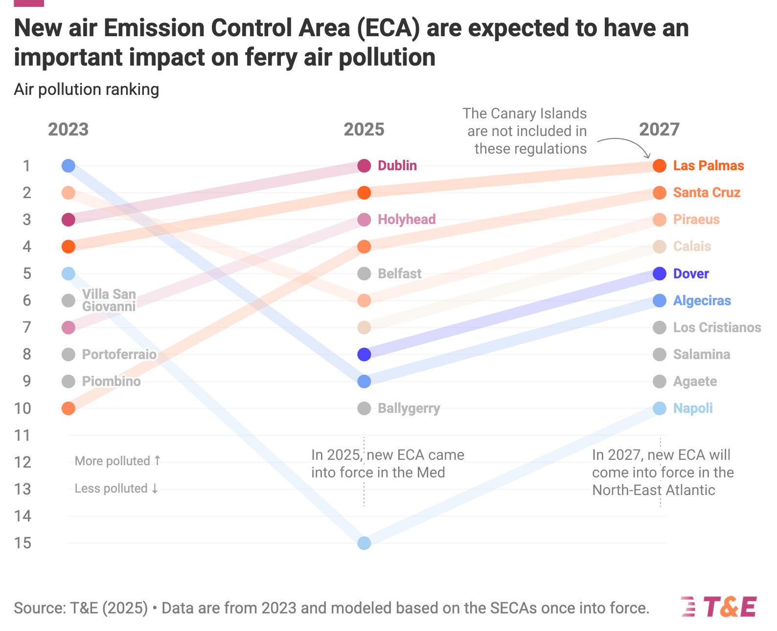 • Dublin (IE) is the most polluted ferry port in 2025, but changes in emissions regulations will see Las Palmas (ES) in top spot in 2027