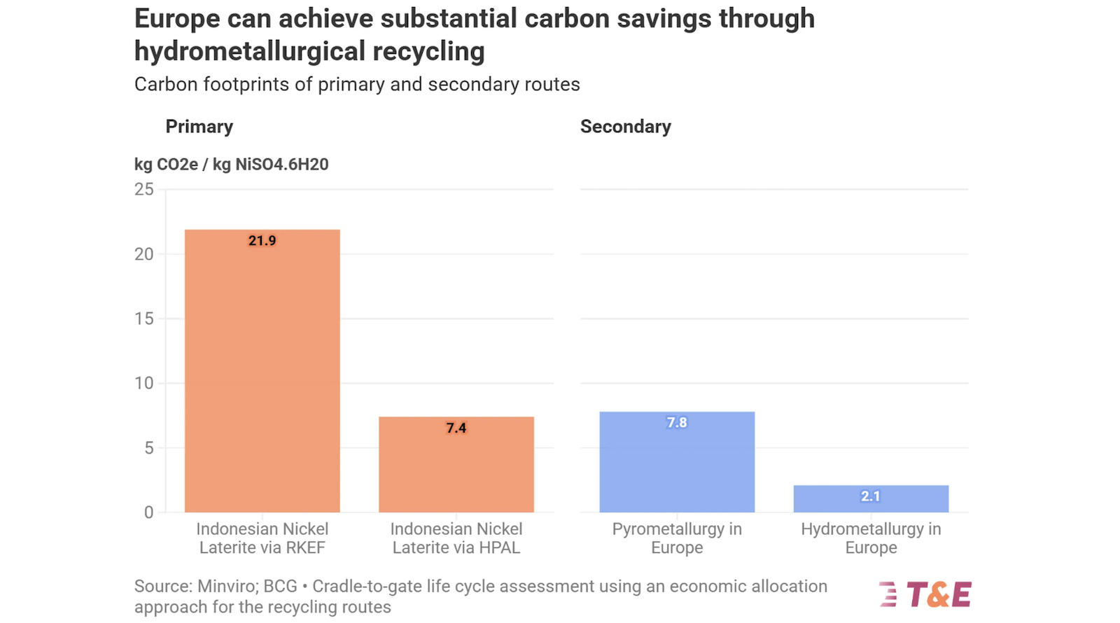 - Hydrometallurgical routes in Europe can reduce the carbon intensity of nickel sulfate by 70% when compared to the dominant primary production routes.