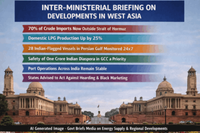 The Government of India on Wednesday held an inter-ministerial briefing at the National Media Centre to review the evolving situation in West Asia and assess its impact on energy supplies, maritime operations, and the safety of Indian nationals in the region.