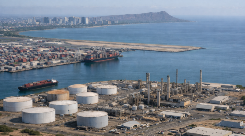 Oʻahu sits at the center of this system. It hosts the Port of Honolulu, the state’s primary international airport, the largest concentration of commercial buildings, and the only petroleum refinery in the state, located in Kapolei. That refinery has a nameplate capacity of about 94,000 barrels per day. At 5.8 million BTU per barrel of crude oil, that capacity equates to roughly 560 million BTU per day, or about 0.16 TWh per day. Over a year at high utilization, that is about 58 TWh of crude input. Actual throughput fluctuates with maintenance and market conditions. Refined products supply Oʻahu directly and are shipped to neighbor islands. Hawaiʻi still imports refined products, including jet fuel and diesel, because local refining does not always match demand by product type.
