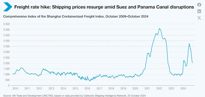 UN Trade and Development’s Review of Maritime Transport 2024 estimates that global consumer prices could increase by 0.6% by 2025 as shipping costs filter through supply chains.
