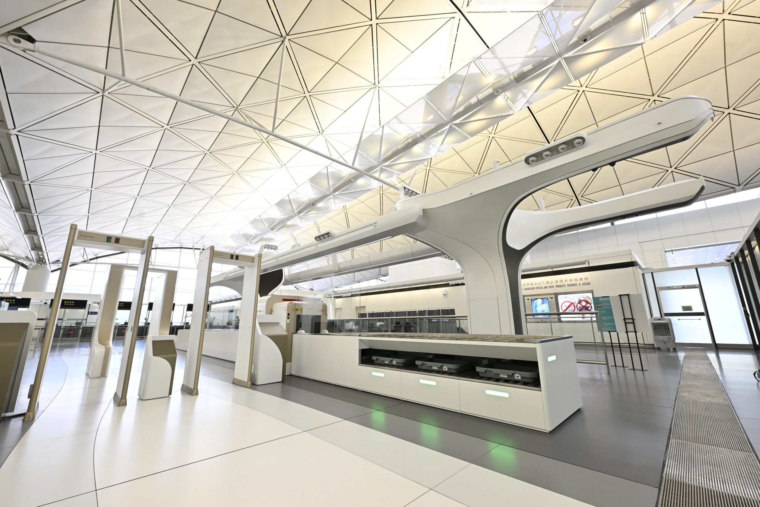 The new passenger security screening system, featuring fifty channels and thirty-two full-body scanners, will be installed and put into operation in Terminal 1 by phases. The first batch at South and North Departures Immigration Halls in Terminal 1 will be put into service on 2 July 2024. Apart from enhancing passenger experience, operational efficiency can also be achieved by introducing the new smart security screening system, increasing the average throughput by about 20%.