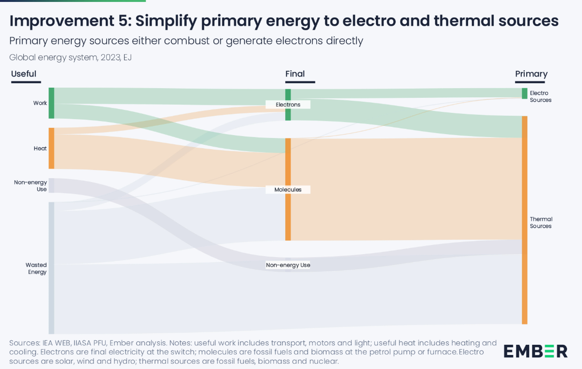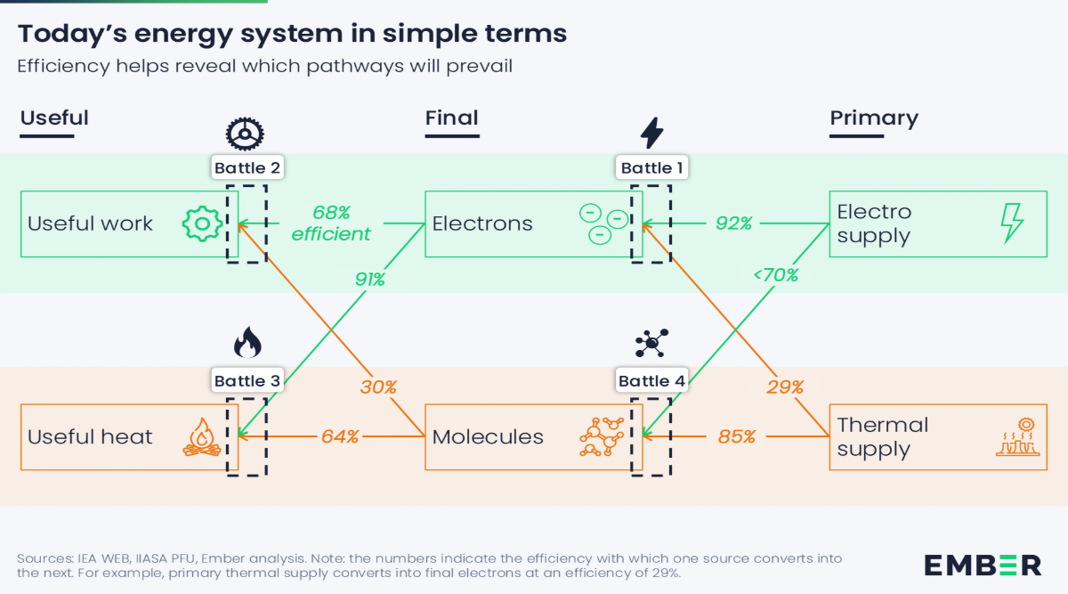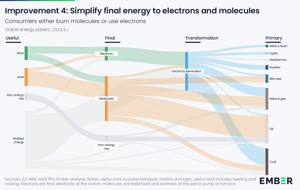 Ember says the energy we use fundamentally involves only two functions — doing work or supplying heat. “Final energy can be understood as two distinct types — electrons and molecules. Electrons deliver work with minimal loss. Molecules must surrender most of their energy to entropy before performing the same task. This is not a matter of technology maturity or cost; the advantage is rooted in thermodynamics. Systems built around electrons will always outperform systems built around molecules when delivering work, and increasingly outperform them for heat as well.”