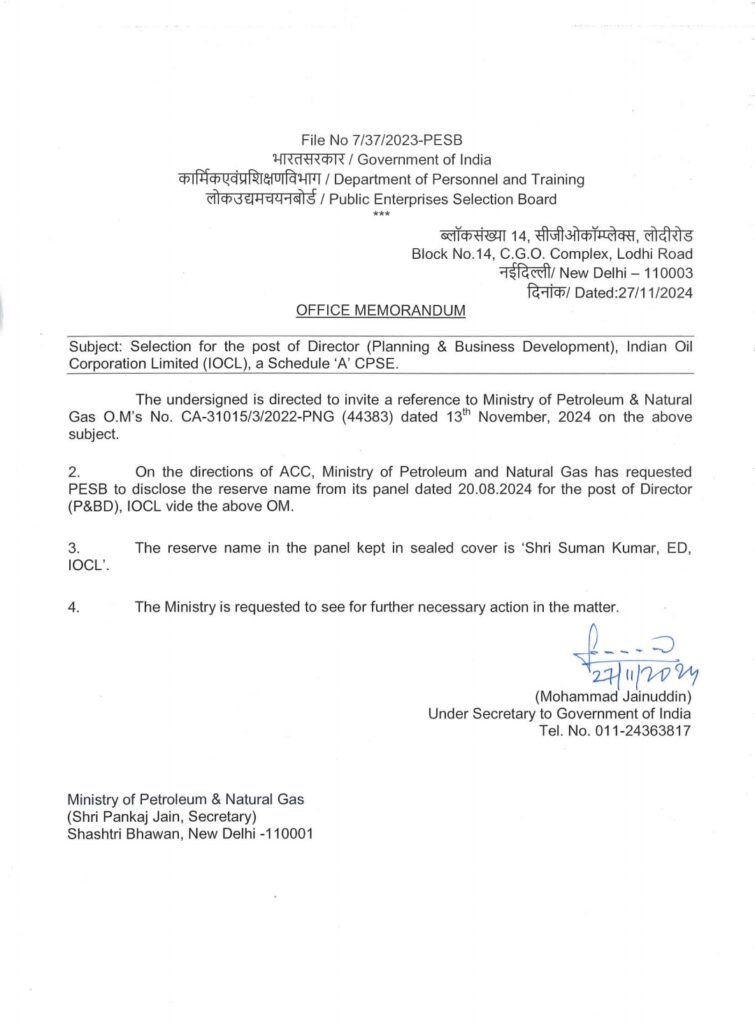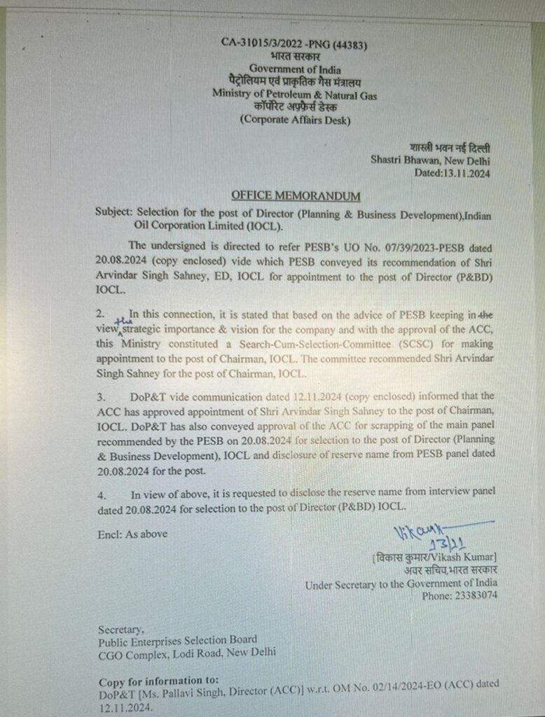 Arvindar Singh Sahney was selected by PESB for the Director (P&BD), who later was also selected as Chairman by Search-Cum-Select-Committee. With is his joining as Chairman on November 13, 2024, the Ministry of Petroleum & Natural Gas (MoP&NG) on the very same day, requested the Public Enterprises Selection Board (PESB). to disclose the name of the reserve candidate for this post.