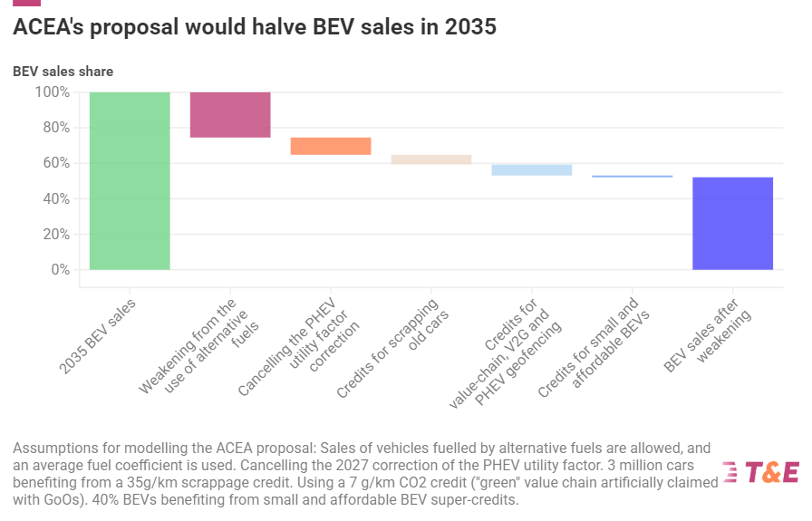 ACEA’s demand to cancel the 2027 “utility factor” for plug-in hybrids would reduce electric car sales by 10%. Giving carmakers CO2 credits for scrapping old cars would reduce the ambition by a further 6%. Credits for CO2 reductions in car production and the use of certain technologies would reduce EV sales by 6%. Counting small EVs as more than one EV sale — with extra credit if made in Europe — would reduce ambition by 1%. Together the loopholes demanded by ACEA mean carmakers would just have to achieve a 52% EV market share in 2035.