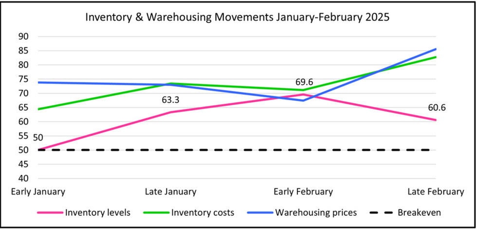 Trade policy played a large role in the monthly findings, which were driven by rising inventory levels. Inventory poured into warehouses in January and February as companies replenished from the holiday peak and attempted to avoid costs associated with tariffs on imports from China, Mexico, and Canada.