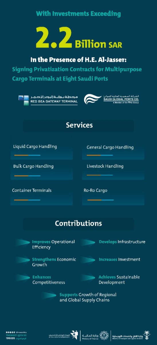 RIYADH : In the presence of H.E. Eng. Saleh bin Nasser Al-Jasser, Minister of Transport and Logistic Services and Chairman of the Saudi Ports Authority, Mawani — in collaboration with the National Center for Privatization — signed contracts to privatize multipurpose cargo terminals at eight Saudi ports under a Build-Operate-Transfer (BOT) model spanning 20 years. The agreements were signed with national partners Saudi Global Ports and Red Sea Gateway Terminal Company, with private sector investments exceeding SAR 2.2 billion.