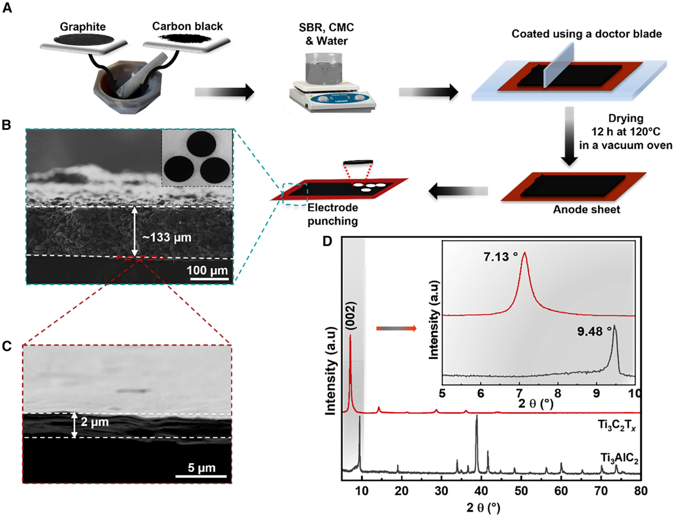 The final test of the components examined the cycling stability and recyclability of the MXene current collector. After eight weeks of continuous charging and discharging, the MXene–graphite electrode maintained good adhesion; the graphite active material remained evenly distributed, and did not detach from the MXene film.