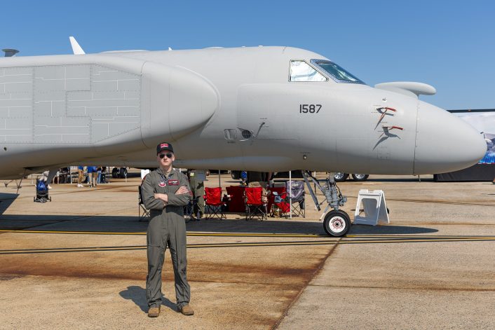 Standing beside the Compass Call on the tarmac, dressed in his flight suit and patiently fielding questions from curious visitors, the young 1st Lieutenant (now, newly pinned Captain) was both approachable and proud of the mission he represents. Though careful not to reveal classified details, he spoke candidly about the unique demands of flying the EA-37B and what it means to serve as part of a crew entrusted with such a specialized role. Our conversation offered a glimpse into the human side of a platform most people only read about in brief defense headlines.