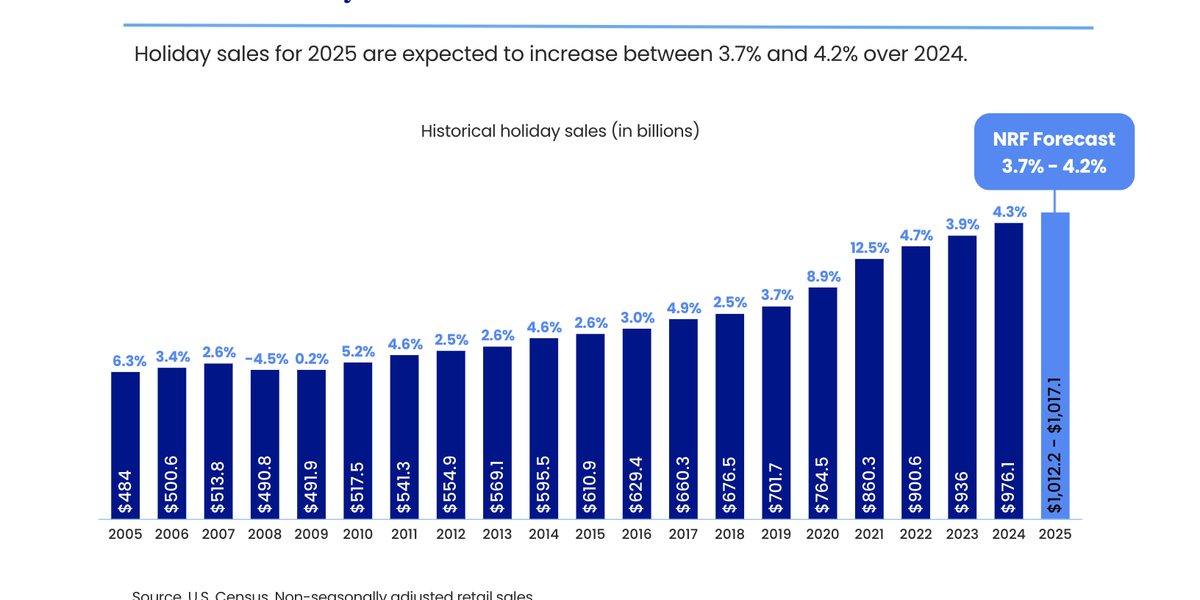 Holiday retail spending is predicted to post a smaller annual increase than last year, according to a National Retail Federation (NRF) forecast that shoppers will push retail sales in November and December up by 3.7% to 4.2% over 2024, coming in below last year’s hike of 4.3%.