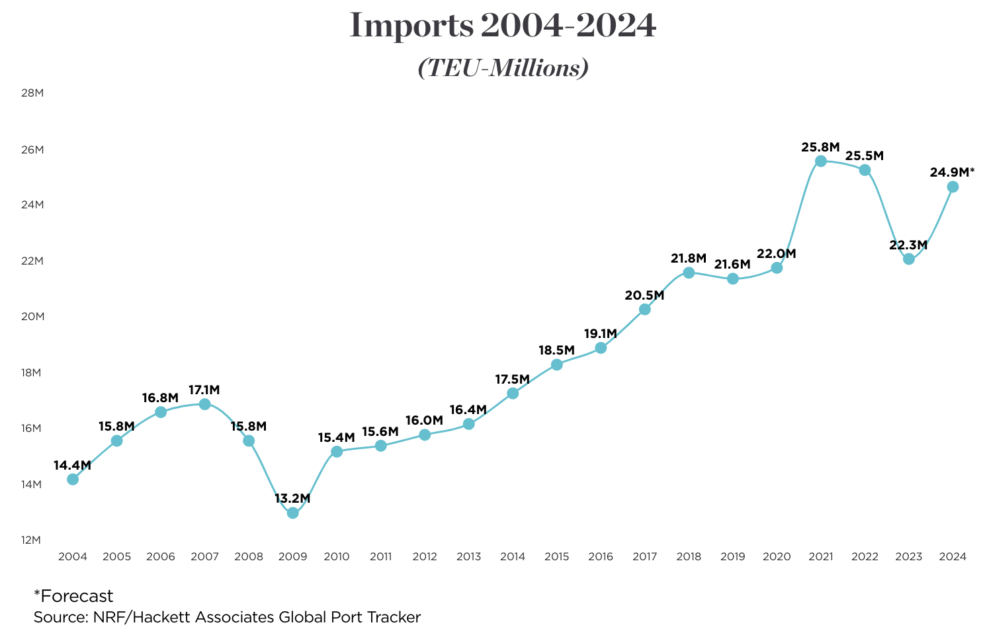 Ports have not yet reported July’s numbers, but Global Port Tracker projected that volume shot up to 2.34 million TEU, up 22.1% year over year and the highest level since the record of 2.4 million TEU set in May 2022. August is forecast to also total 2.34 million TEU, up 19.2% year over year. If trends continue, those numbers would bring 2024 to 24.9 million TEU, up 12.1% from 2023.