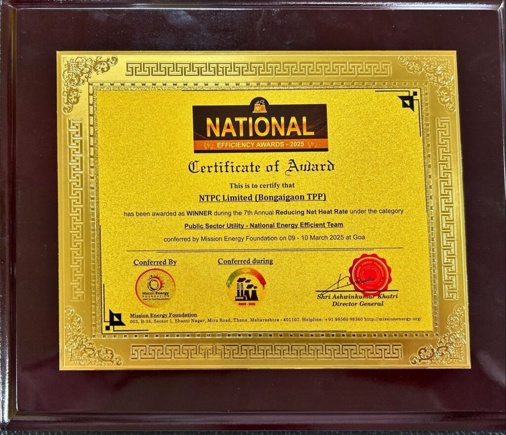 NTPC Bongaigaon -750 MW (3×250 MW) has been awarded the Public Sector Utility – National Energy Efficient Team title at the National Efficiency Awards 2025. The award, conferred by the Mission Energy Foundation during the 7th Annual Reducing Net Heat Rate Conference & Awards in Goa, recognizes the station’s excellence in improving energy efficiency.