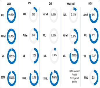 Call Setup Success Rate: Airtel, BSNL, RJIL and VIL have 99.70%, 95.03%, 99.85% and 98.93% Call Setup Success Rate respectively in Auto-selection mode (5G/4G/3G/2G).