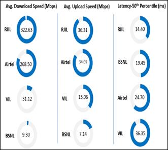 Summary-Data services Data Download performance (Overall):Average download speed of Airtel (5G/4G) is 268.50 Mbps, BSNL (4G/3G/2G) is 9.30 Mbps, RJIL (5G/4G) is 322.63 Mbps and VIL (4G/2G) is 31.12 Mbps. Data Upload performance (Overall):Average upload speed of Airtel (5G/4G) is 34.02 Mbps, BSNL (4G/3G/2G) is 7.14 Mbps, RJIL (5G/4G) is 36.31 Mbps and VIL (4G/2G) is 15.06 Mbps. Latency (Overall):Airtel, BSNL, RJIL & VIL 50th percentile latency is 24.70 ms, 19.45 ms, 14.40 ms & 36.35 ms respectively. Data performance – Hotspots (in Mbps): Airtel- 4G D/L: 37.50 4G U/L: 13.14 5G D/L: 389.99 5G U/L: 55.37 BSNL- 4G D/L: 8.10 4G U/L: 9.11 RJIL- 4G D/L: 44.71 4G U/L: 8.77 5G D/L: 389.91 5G U/L: 35.00 VIL- 4G D/L: 26.41 4G U/L: 19.19 Note- “D/L” Download speed, “U/L” Upload speed Note- “D/L” Download speed, “U/L” Upload speed |